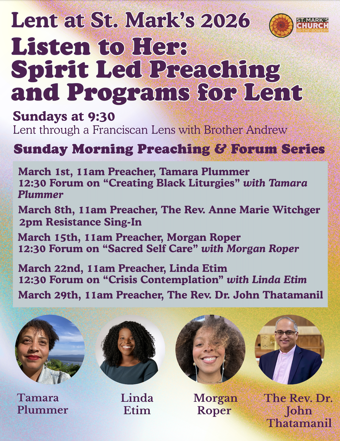 Join Rev. Anne Marie, Jeannine Otis and the St. Mark’s Choir along with interfaith leaders across the city for a weekly witness for democracy. The group gathers every Monday, but St. Mark’s will lead the program this week. We’ll sing, pray, read poetry, and testify to our moral values. Everyone is welcome.